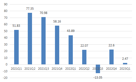 2021Q1-2023Q1京东方单季归母净利润(单位:亿元),数据来源:京东方财报
