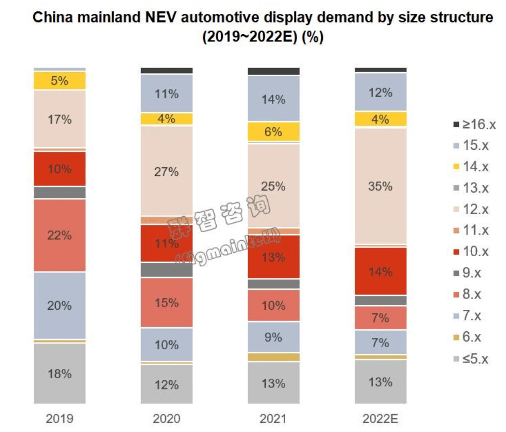 2019-2022年中国新能源汽车车载屏幕尺寸统计情况,来源:群智咨询