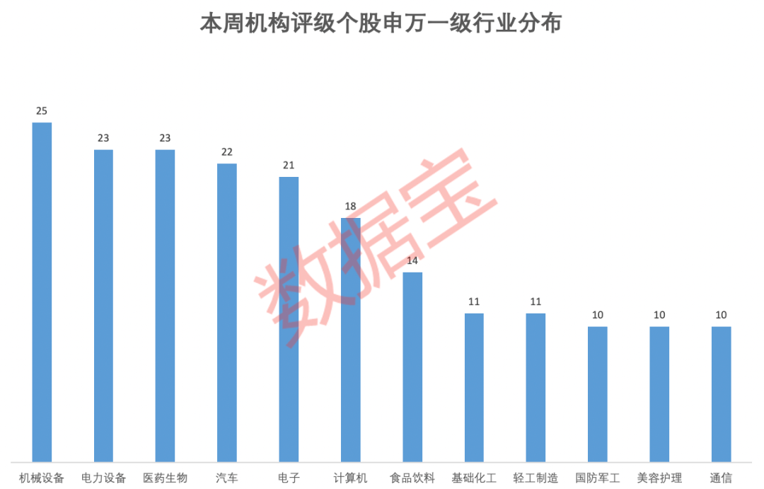 申万一级行业中,机械设备行业评级个股数量居首,共计25股;其后电力设备、医药生物、汽车、电子等行业获评个股数量均在20股以上。