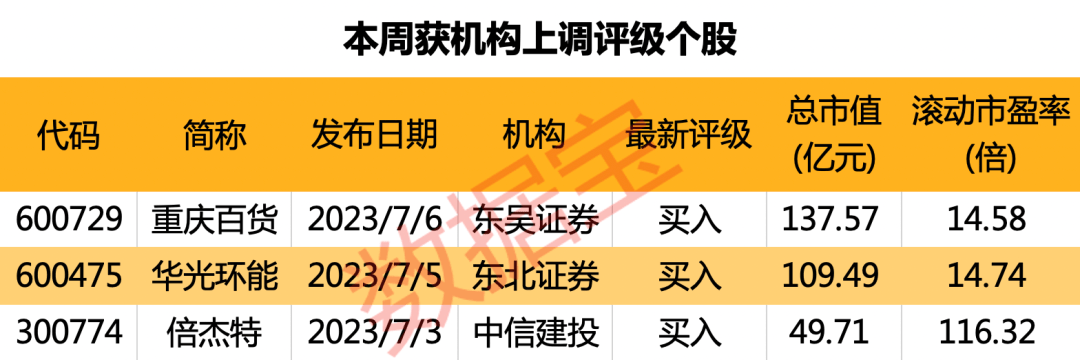 7月3日至7日,机构合计上调3股评级:东吴证券上调重庆百货至“买入”;东北证券上调华光环能至“买入”;中信建投上调倍杰特至“买入”。