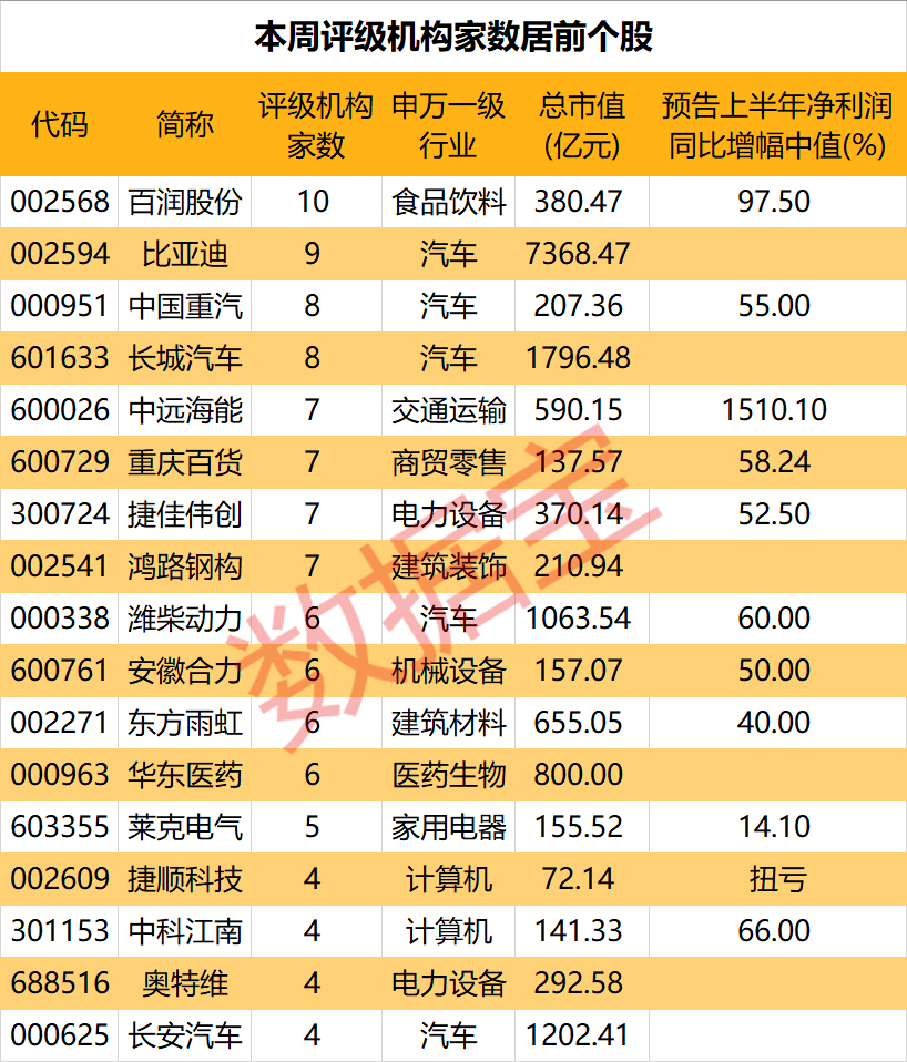 个股方面,共计17股获4家及以上机构给予“买入型”评级。预调酒龙头百润股份最受关注,10家机构参与评级。一众汽车股冲至评级前列,比亚迪、中国重汽、长城汽车评级机构依次为9家、8家和8家;潍柴动力和长安汽车评级机构数量也居前。