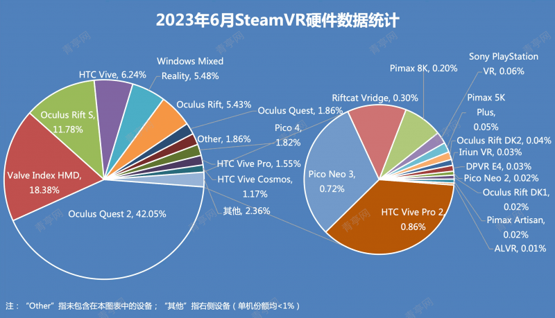 根据Steam平台公布的数据统计,2023年6月SteamVR活跃玩家占Steam总玩家数量的1.73%,较上月(1.87%)下跌0.14个百分点,本月还新加入大朋E4机型。相关阅读:《6月VR大数据:Quest 2下跌2个百分点,SteamVR统计加入大朋E4》。