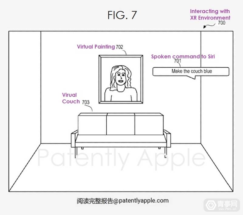 USPTO公布的一项苹果专利中,也指出一种基于语音生成AR/VR内容的方法,比如用户可命令Siri语音助手在物理场景中加入虚拟家具,并改变家具的颜色等等。