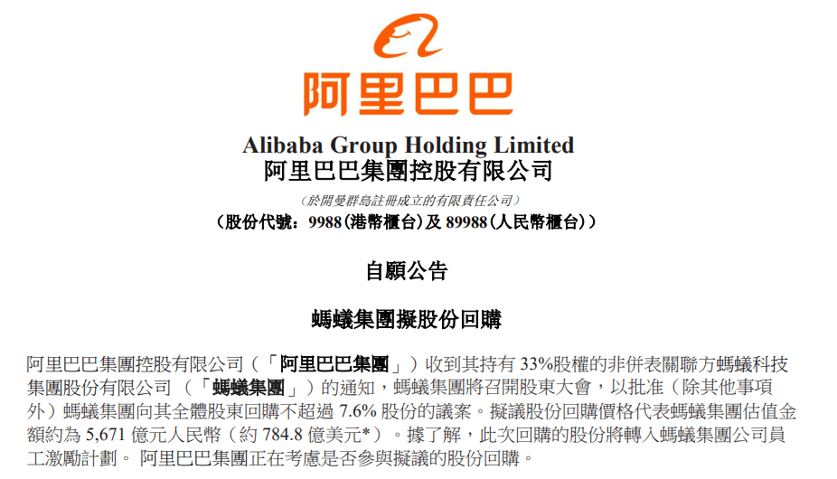 鞭牛士 7月9日消息,阿里巴巴在港交所发布公告称,阿里巴巴集团收到其持有33%股权的非并表关联方蚂蚁科技集团股份有限公司的通知,蚂蚁集团将召开股东大会,以批准(除其他事项外)蚂蚁集团向其全体股东回购不超过7.6%股份的议案。