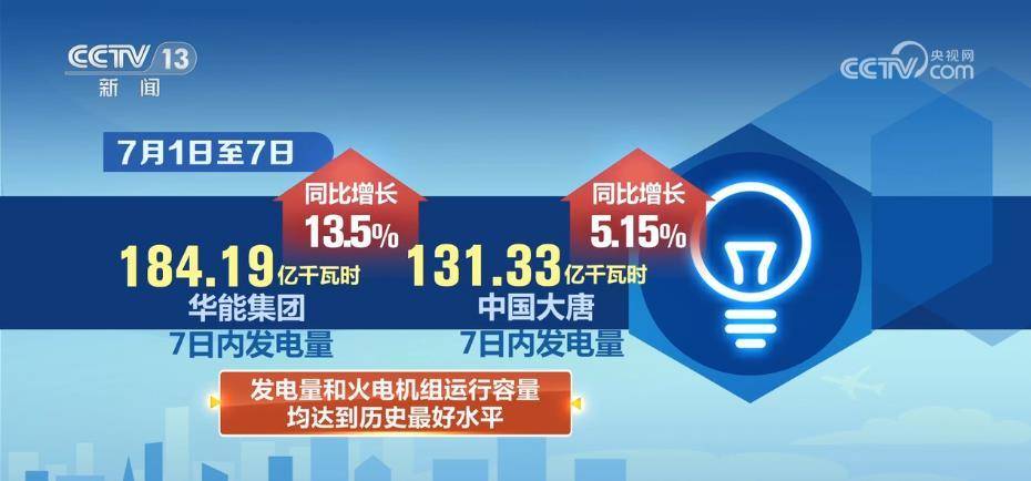 最新数据显示,7月1日至7日,中国华电集团用煤量达到475万吨,较去年同期增长13.5%;华能集团、中国大唐在这7日内发电量分别达到184.19亿千瓦时、131.33亿千瓦时,同比增长13.5%、5.15%,发电量和火电机组运行容量均达到历史最好水平。