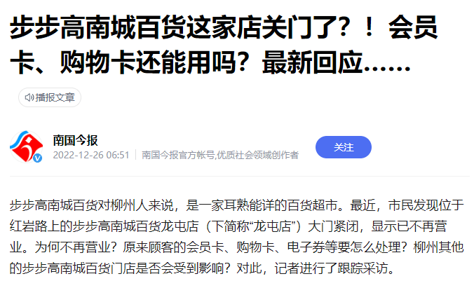 在公告中显示,步步高南城百货声笛店 因公司业务调整,门店将于2023年7月7日正式停止营业,凡持有步步高南城百货芦笛店会员卡、购物卡及电子券的顾客,可以继续在步步高南城百货其他门店使用。