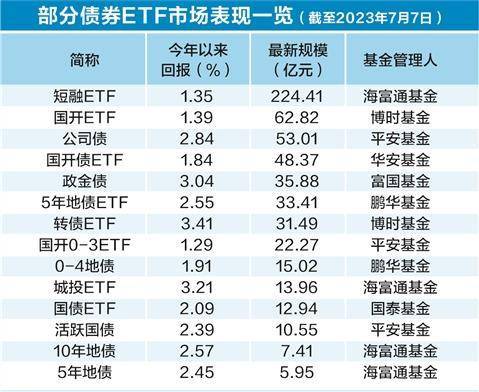 截至7月7日,除了跟踪中证短融指数的海富通中证短融ETF,规模居前的债券ETF还有博时基金国开ETF、平安基金公司债ETF、华安基金国开债ETF和富国基金政金债ETF,最新规模分别为62.82亿元、53.01亿元、48.37亿元和35.88亿元。