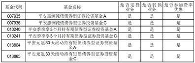 2、基金转换是指基金份额持有人按照《基金合同》和基金管理人届时有效公告规定的条件,申请将其持有基金管理人管理的、某一基金的基金份额转为基金管理人管理的、且由同一注册登记机构办理注册登记的其他基金的基金份额的行为。基金转换业务规则与转换业务的收费计算公式参见本公司网站的 《平安基金管理有限公司旗下开放式基金转换业务规则说明的公告》。