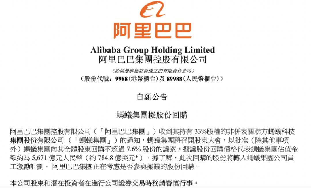 阿里巴巴9日晚间港交所公告称,集团收到其持有33%股权的非并表关联方蚂蚁集团的通知,蚂蚁集团将召开股东大会,以批准(除其他事项外)蚂蚁集团向其全体股东回购不超过7.6%股份的议案。