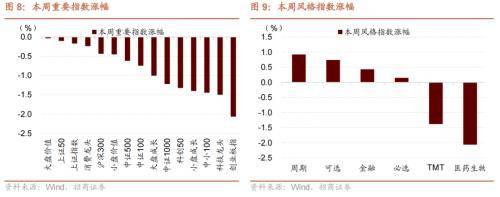 本周A股主要指数全部下跌,主要指数中大盘价值、上证50相对抗跌,分别下跌0.03%、0.10%;主要指数中科技龙头,创业板指跌幅靠前,分别下跌1.50%和2.07%。