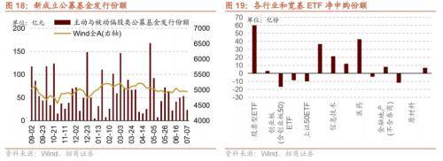 从ETF净申购来看,ETF净申购,宽指ETF以净赎回为主,其中创业板(含创业板50)ETF赎回最多;行业ETF以净申购为主,其中医药ETF申购较多,军工ETF赎回较多。具体来看,股票型ETF总体净申购60.0亿份。其中,沪深300、创业板ETF、中证500ETF、上证50ETF和双创50ETF分别净申购3.1亿份、净赎回16.6亿份、净赎回8.6亿份、净赎回10.0亿份、净赎回0.2亿份。行业方面,信息技术ETF净申购21.5亿份;消费ETF净申购12.1亿份;医药ETF净申购42.7亿份;券商ETF净赎回4.2亿份;金融地产ETF净申购8.2亿份;军工ETF净赎回11.8亿份;原材料ETF净申购0.3亿份;新能源&智能汽车ETF净申购6.8亿份。