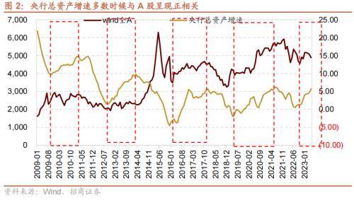 从历史来看,如果以央行总资产增速作为货币环境的重要指标,在央行的总资产增速上行的过程中,A股往往保持震荡上行的趋势。