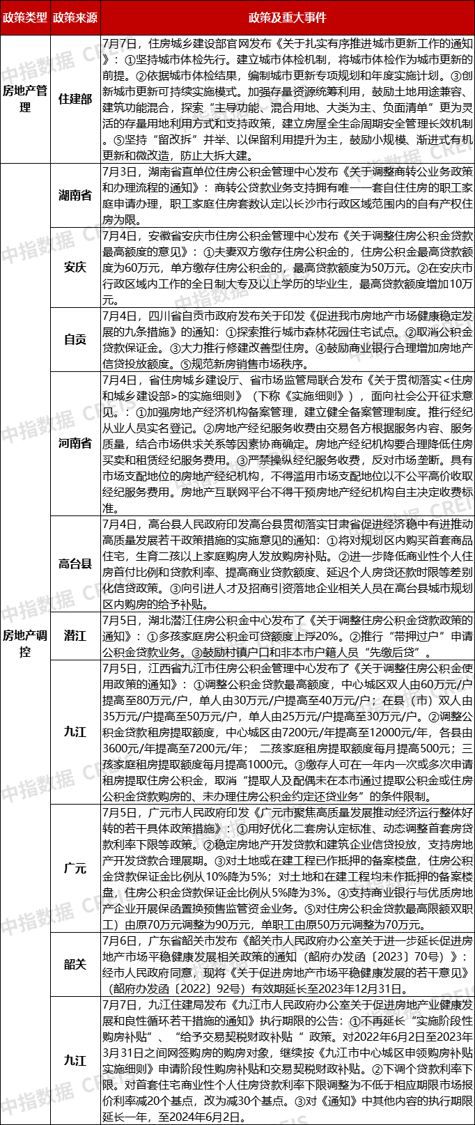 表:7月3日至7月9日房地产市场重点政策及事件汇总
