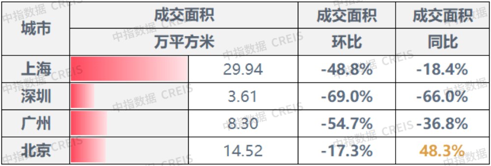 ▍一线城市:整体成交面积环比下降46.8%,深圳、广州降幅最大