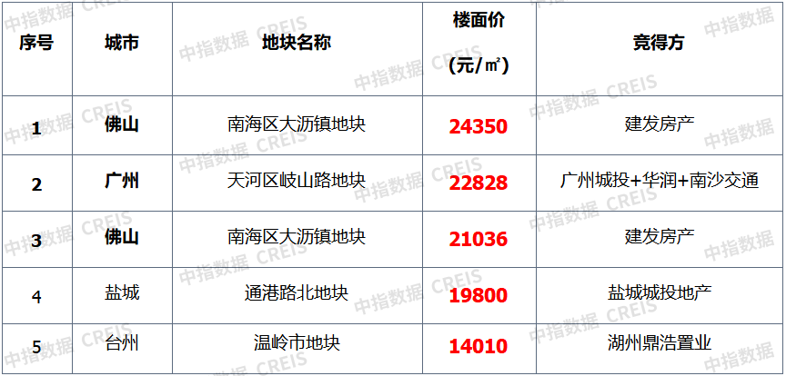 ▍宅地单价TOP5:榜单均价环比下行,佛山南海区宅地领衔