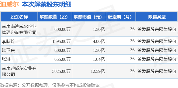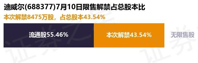 根据市场公开信息整理,迪威尔(688377)于7月10日将有8475.0万股限售股份解禁上市,为公司首发原股东限售股份,占公司总股本43.54%。本次解禁后,公司已无限售股份。具体如下图所示: