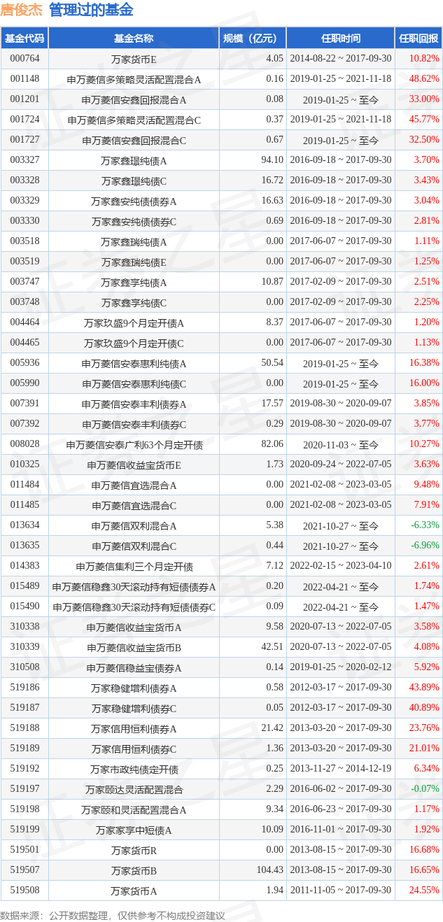 唐俊杰先生:硕士研究生。2008年起从事金融相关工作,曾任金元证券固定收益总部投资经理,万家基金固定收益部基金经理、总监。2017年10月加入申万菱信基金,现任固定收益投资部总监,申万菱信安鑫回报灵活配置混合型证券投资基金、申万菱信安泰惠利纯债债券型证券投资基金基金经理。2019年1月25日至2020年2月12日任申万菱信稳益宝债券型证券投资基金基金经理。2020年7月13日-2022年7月5日申万菱信收益宝货币市场基金基金经理。2019年8月30日至2020年9月7日担任申万菱信安泰丰利债券型证券投资基金基金经理。2020年11月3日担任申万菱信安泰广利63个月定期开放债券型证券投资基金基金经理。曾任申万菱信多策略灵活配置混合型证券投资基金基金经理。2022年2月15日至2023年4月10日任申万菱信集利三个月定期开放债券型证券投资基金基金经理。