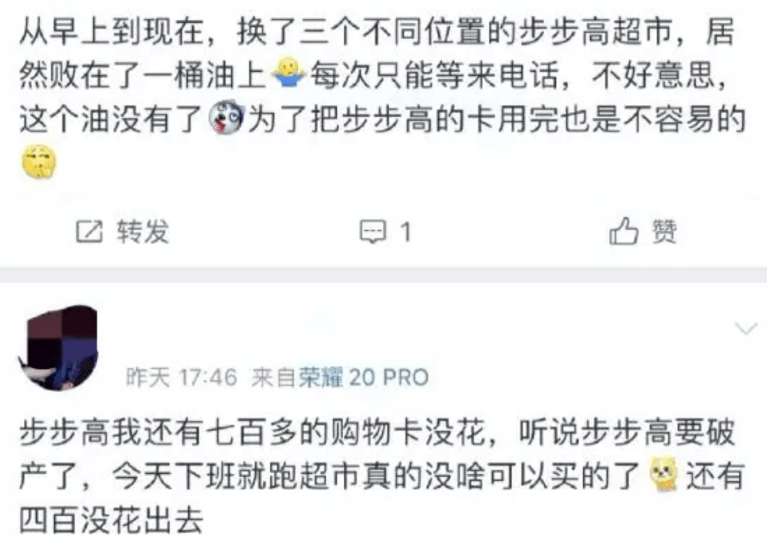 在信息时代,这样的信息很快一传十十传百,越来越多步步高会员卡的消费者前去抢货,对步步高门店形成了“挤兑”,导致许多货架出现大面积清空。此时步步高并未做出会员卡购物的限制,但如果数千万会员持续不断的“挤兑”这将对步步高的经营带来巨大冲击。