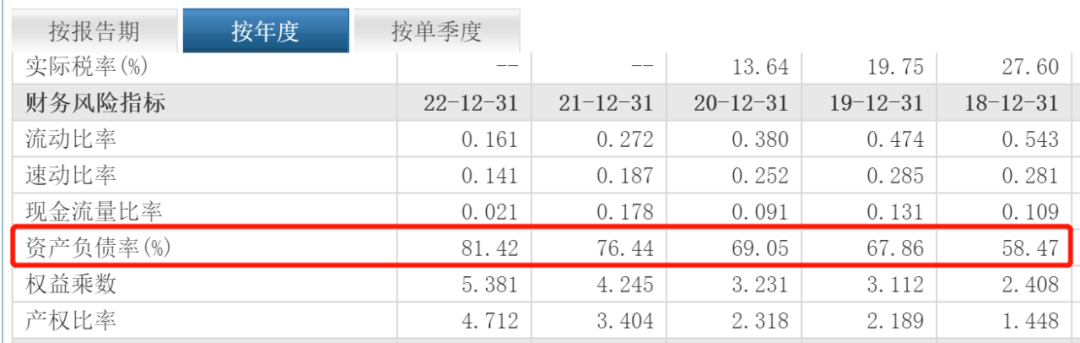 如果地产行业一直火爆,或许该笑的是王填,但地产行业的低迷远超零售行业,且地产短期内都无法再恢复昔日的火爆局面,在地产领域,王填不仅未能获得理想回报,还为步步高带来沉重债务。财报显示2022年年底,步步高累计负债达227.2亿元,流动性负债达162亿元,对于如今年总营收只有87.45亿元的步步高来说,如此庞大的债务已经压得步步高喘不过气来。资产负债率由2018年的58.47%一路飙升至2022年的81.42%。