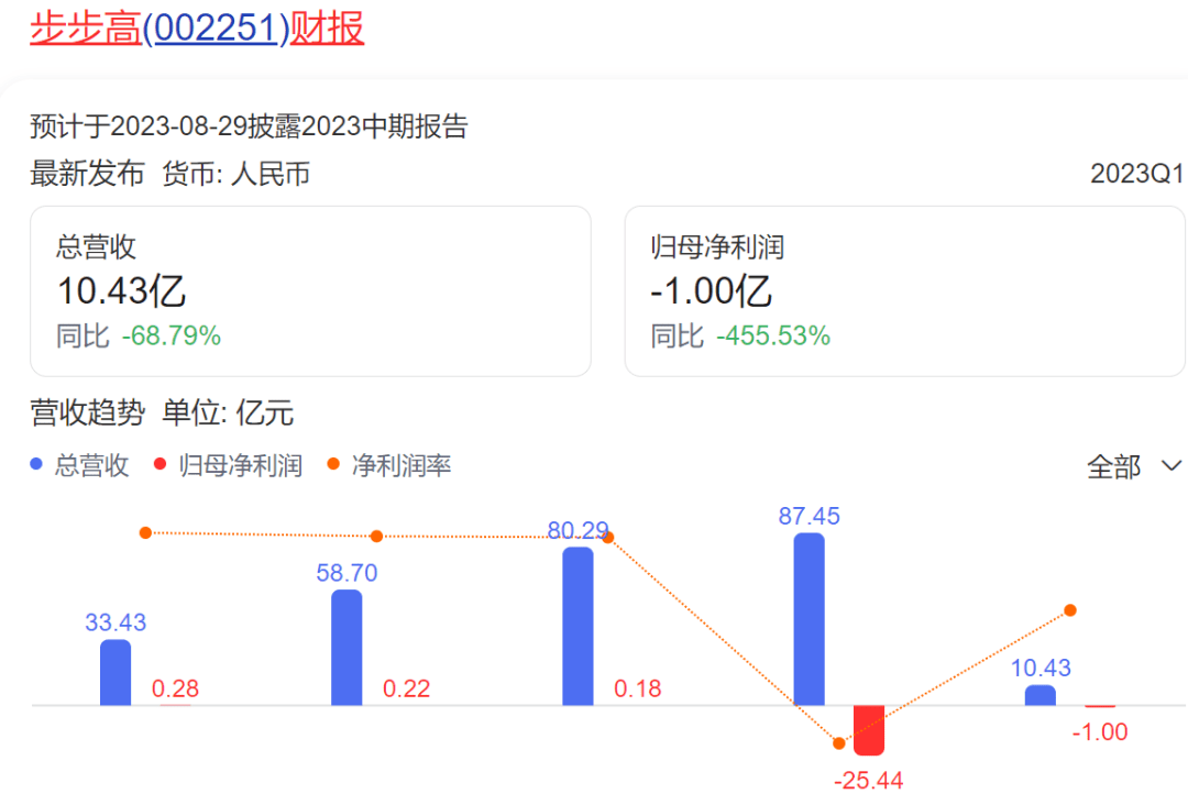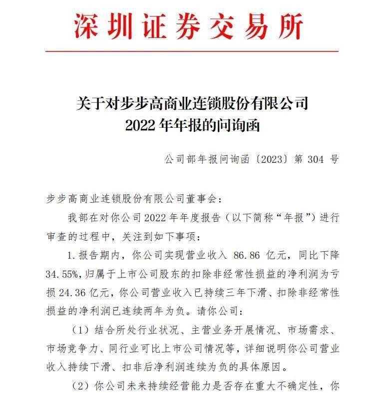 近日,深交所向步步高发出问询函,对步步高营收持续三年下滑、扣除非经常性损益的净利润连续两年为负提出质询。2022年步步高总营收86.86亿元,同比下降34.55%,扣非净利润为亏损24.36亿元。