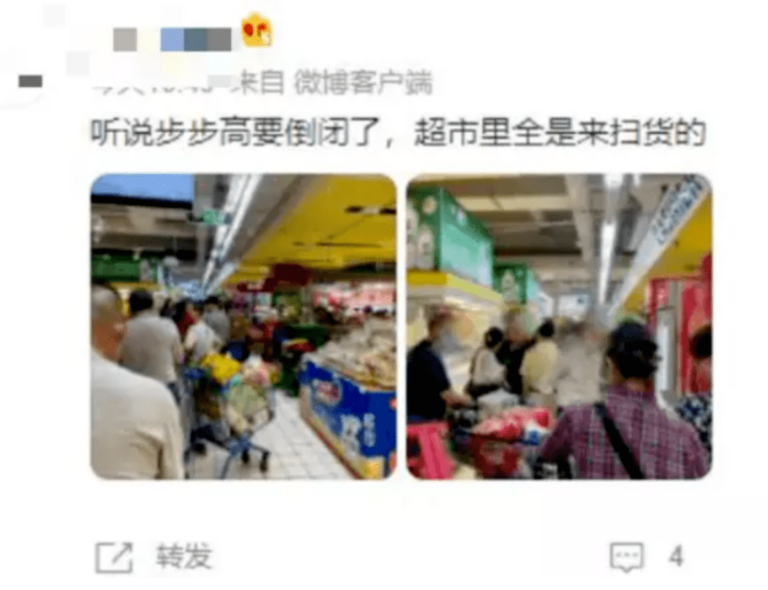 这就像银行出现要破产的传闻之后,蜂拥而至导致的“挤兑”一样,原本只是经营压力,却可能会因为“挤兑”而遭受灭顶之灾。步步高超市同样遭遇众多消费者的“挤兑”。有网友在微博上晒出步步高超市的“挤兑”场景,从图片中可以看出,结账的人群排起了长队,场面甚为壮观。