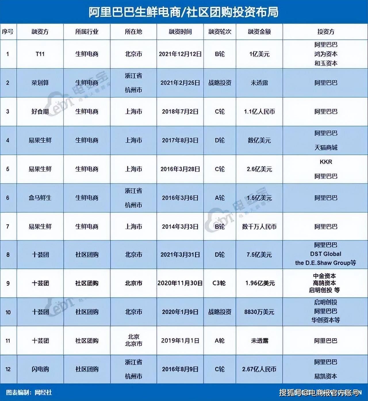 值得注意的是,菜划算并非阿里唯一看走眼的生鲜项目。网经社数据显示,2014年至今,阿里巴巴共投资过5家生鲜电商企业及2家社区团购企业,分别为:易果生鲜、盒马鲜生、好食期、菜划算、T11、闪电购、十荟团,累计金额约达123.4亿元。