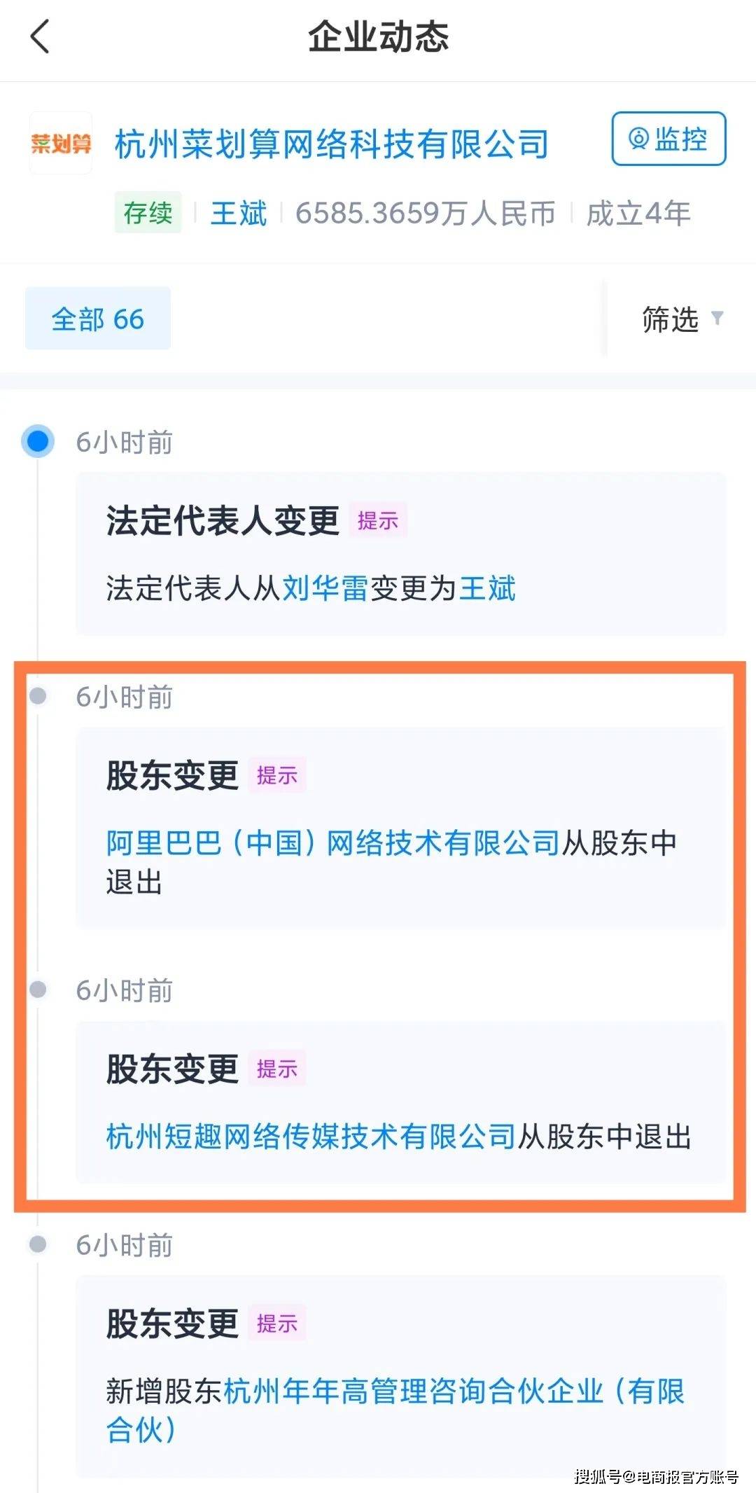 天眼查App显示,近日杭州菜划算网络科技有限公司发生工商变更,阿里巴巴(中国)网络技术有限公司、阿里旗下杭州短趣网络传媒技术有限公司退出股东行列。
