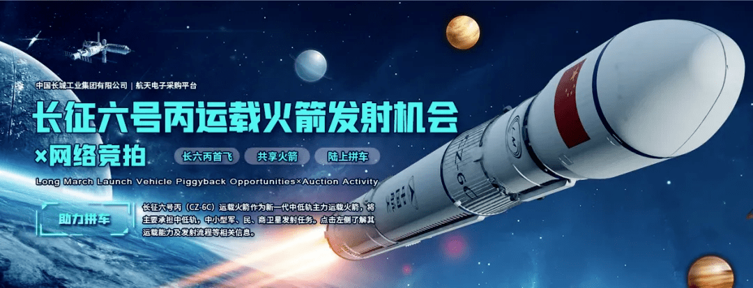 据了解,此次竞拍将在7月13日下午3时开始,参与竞拍的火箭是航天科技集团八院研制的长征六号丙运载火箭,预计今年年底发射。