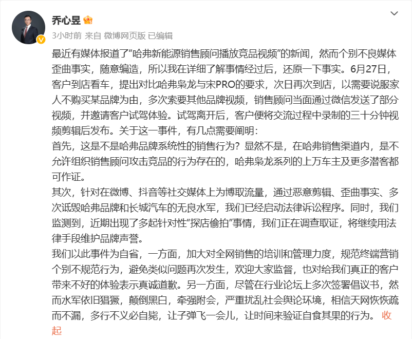 IT之家 7 月 9 日消息,哈弗品牌执行副总经理乔心昱针对“哈弗新能源销售顾问播放竞品视频”作出回应,称不是哈弗品牌系统性的销售行为,不允许组织销售顾问攻击竞品。对于诋毁哈弗品牌和长城汽车的水军,哈弗已经启动法律诉讼程序。对于针对性“探店偷拍”,哈弗正在调查取证,将继续用法律手段维护品牌声誉。