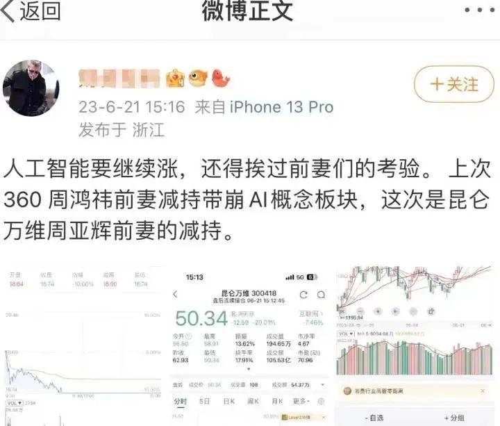 有人说,AI尽头是分手。因为有一大票公司高管纷纷在公司股价大涨之际官宣了离婚,就拿三六零周鸿祎在4月份的离婚案来说,老周曾信誓旦旦地说,自己与妻子胡欢的结婚纪念日是3月17日,质数是不可分解的。结果也在股价大涨之际宣布了离婚,老周直接将持有的4.47亿股票分割至胡欢名下,约占总股本的6.25%,按照当日收盘价计算,总市值约90亿元。同样,受天价分手费事件影响,三六零股价大跌5.53%,对比前一交易日蒸发80亿。
