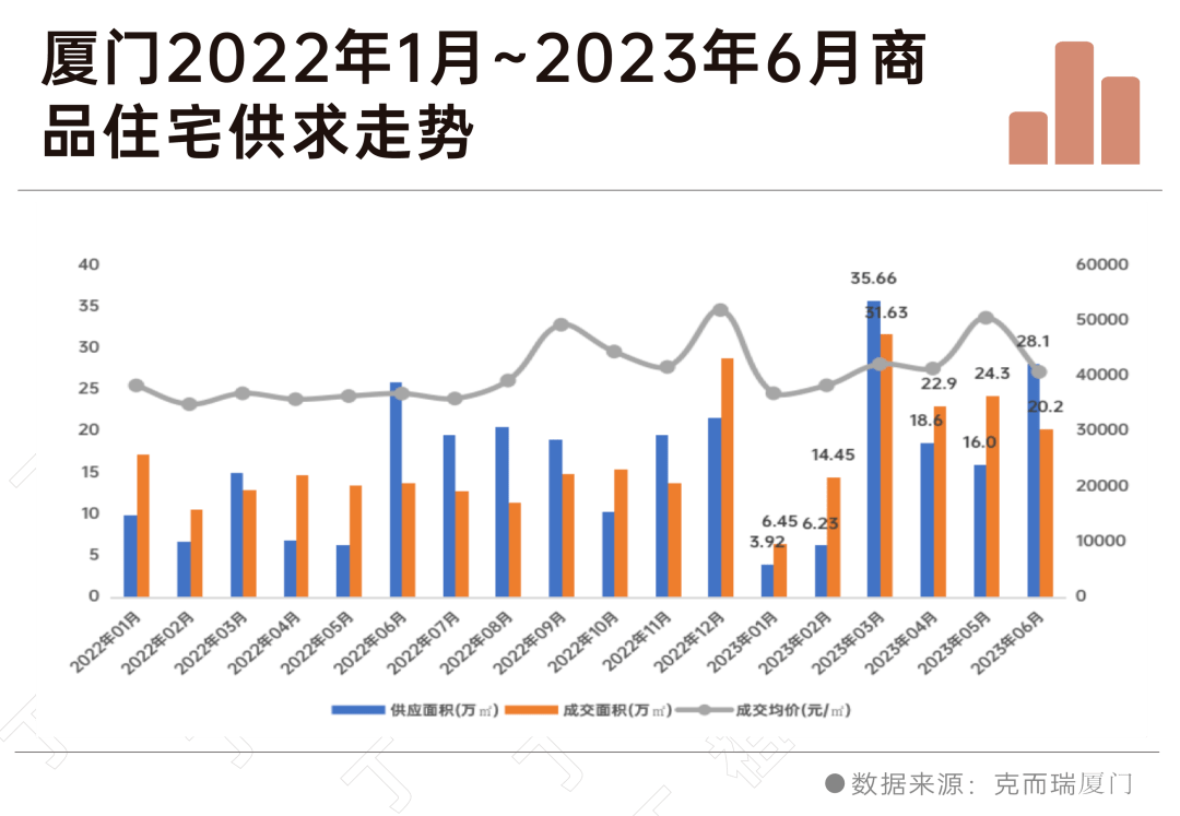 上半年厦门商品住宅新增供应108.55万平米,环比下跌1.73%,同比上涨53.75%;成交119.91万平米,环比上涨23.74%,同比上涨45.15%;成交均价42585元/平米,环比下跌5.64%,同比上涨16.64%。