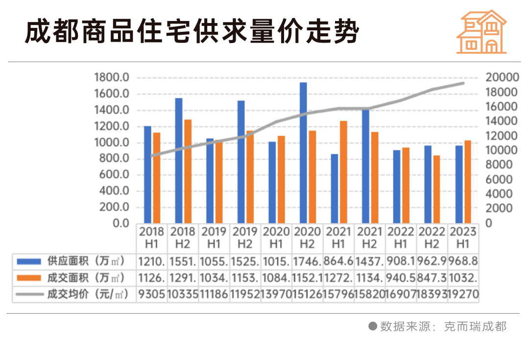 也就是说,成都上半年的新房市场整体处于供小于求的态势,这也造成房价一路上扬,上半年,成都商品住宅成交均价19270元/平米,环比上涨4.8%,同比上涨14%,较2018年提高107%,价格涨势显著。