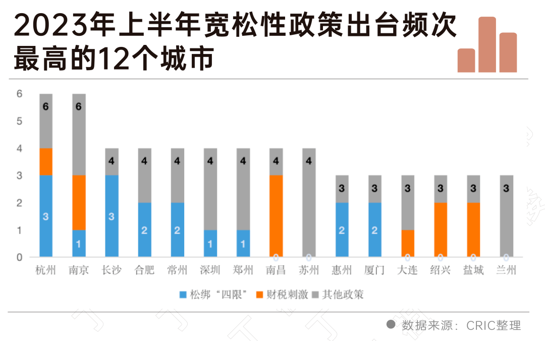 这其中,宽松政策出台频次最高的城市是杭州和南京,都分别出台了9次宽松性政策,并多次调整限制政策的实施范围,其中杭州有3次涉及四限政策。