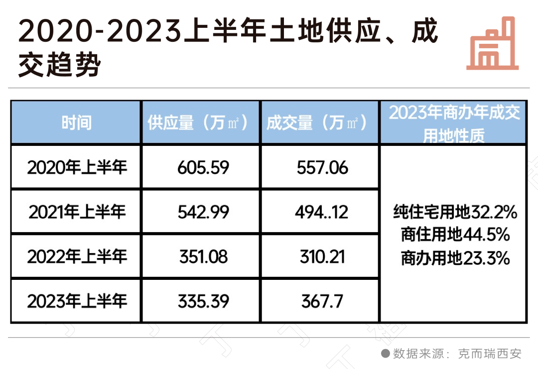 上半年,西安土地供应335.39万平米,相较于2022年上半年呈下降趋势, 但土地成交量达336.7万平米,同比呈上升趋势。从土地性质来看,商住用地为主,占到40%以上。