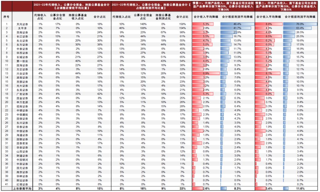 以广发证券为例,在代销产品收入、旗下基金公司主动权益产品费率分别下降20%,公募分仓佣金收入下降30%的假设下,我们测算其2021-22年平均收入、税前利润降幅分别为5%/8%。