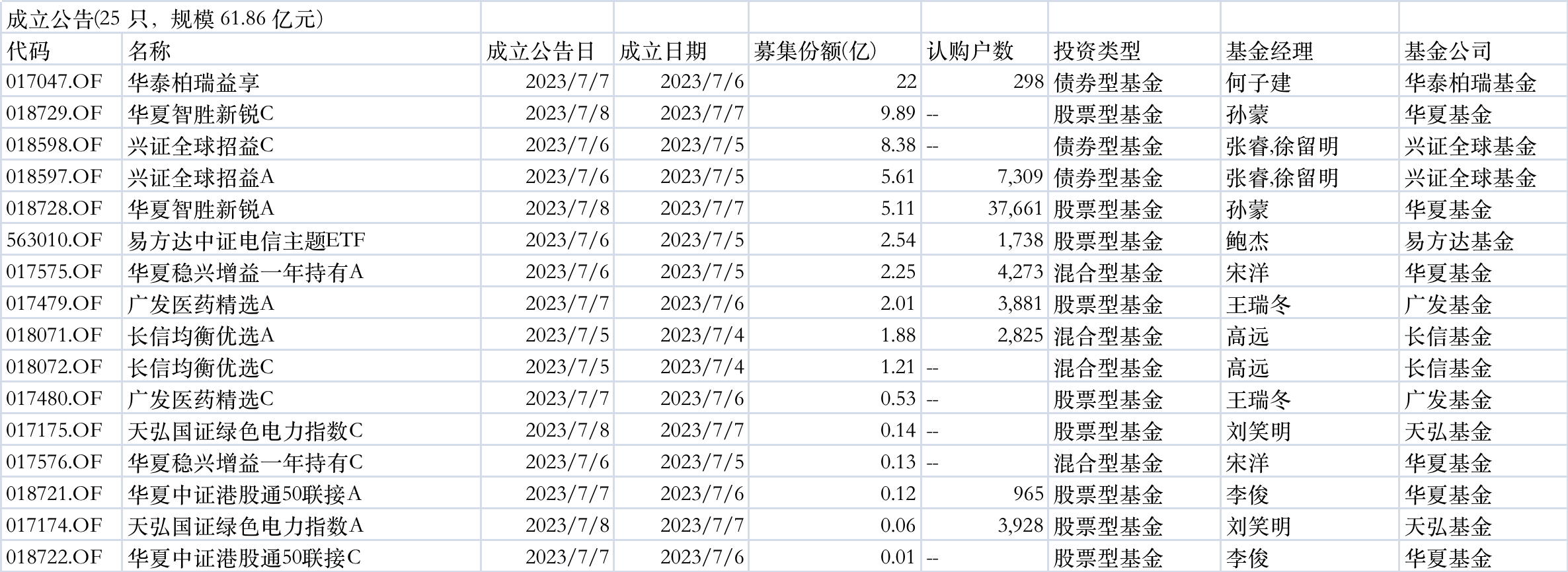 Wind数据显示,上周共25只基金发布成立公告,总规模61.86亿元;共33只基金发布发行公告,30只基金首发,5只基金上市。