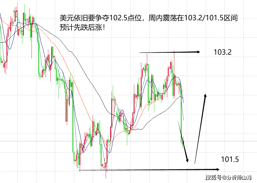 美元正常开盘在101.9附近,周评讲过,在上周争夺102.5点位得失后,先涨后跌,上涨走在103.2高点,下跌最终收盘在101.9附近,虽然上周ADP数据,非农数据都对美元产生一定的影响,但实际没有走出本质性的波动,依旧围绕在102.5附近震荡,所以,基本没有改变暂时对美元的看法,本周美元继续保持在102.5附近争夺,站稳102.5之上就是震荡强势,在102.5之下就是震荡弱势。目前收盘在101.9附近,本周美元的支撑点在101.5,震荡慢跌后再看反弹上涨空间,上方依旧看103.2双顶高点。因此,按照美元的先跌后涨走势,黄金下跌预计先跌后涨或者震荡休整。