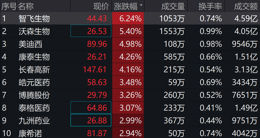该基金紧密跟踪中证创新药产业指数,该指数现上涨1.45%,指数成份股中,智飞生物上涨6.24%,沃森生物上涨5.4%,美迪西、康泰生物等个股跟涨超4%。
