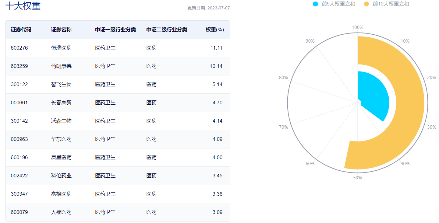 数据显示,截至2023年7月7日,该指数前十大权重股包含恒瑞医药、药明康德、智飞生物、长春高新、沃森生物等,前十大集中度为53.24%。(数据来源:中证指数公司,指数成份股不代表个股推荐)