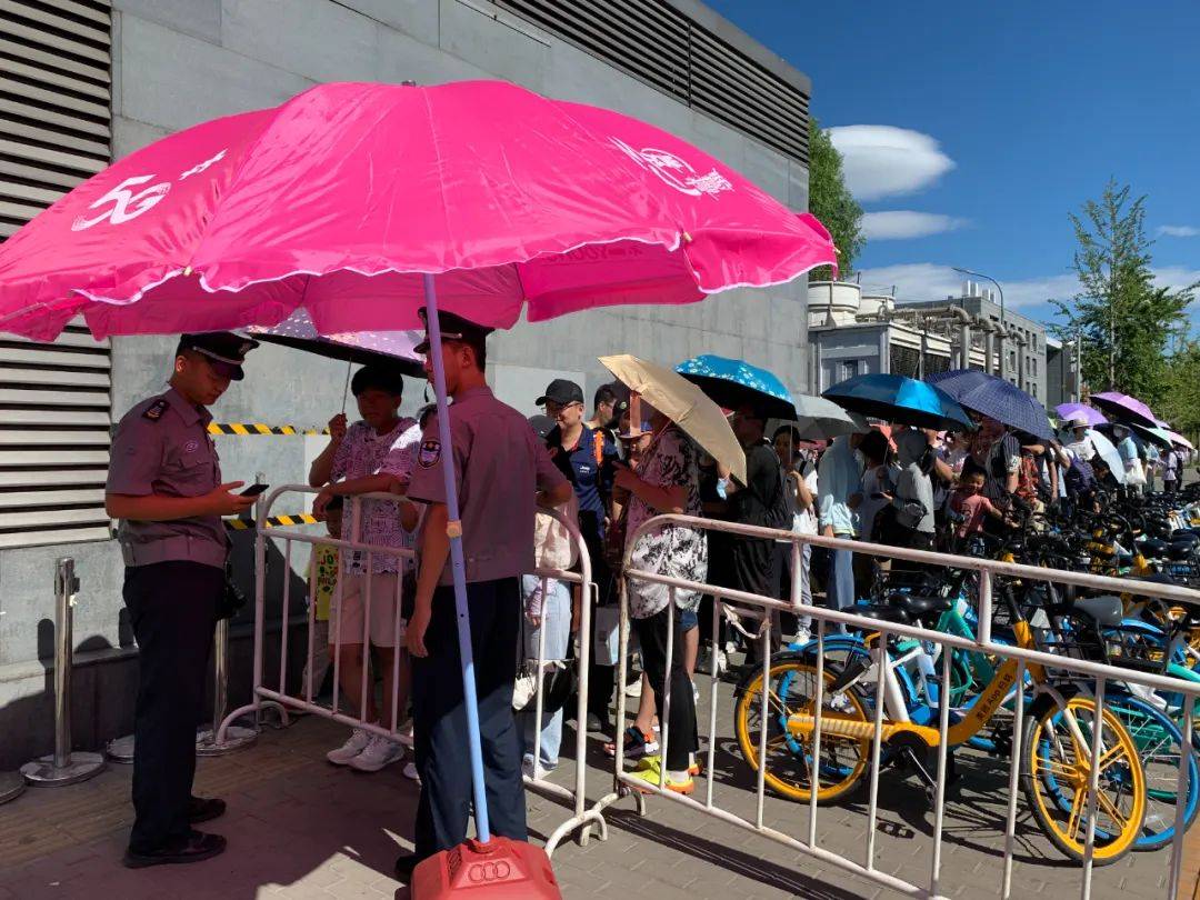 早上8点40分许,在地铁四号线北京大学东门站A口北大东侧门校园参观专用通道前,尽管校园尚未开门,但入校通道前已排了约两百位游客,很多游客都是带着孩子一起来的。天气炎热,一半的游客打起了伞。两名保安手持喇叭引导着游客有序排队。