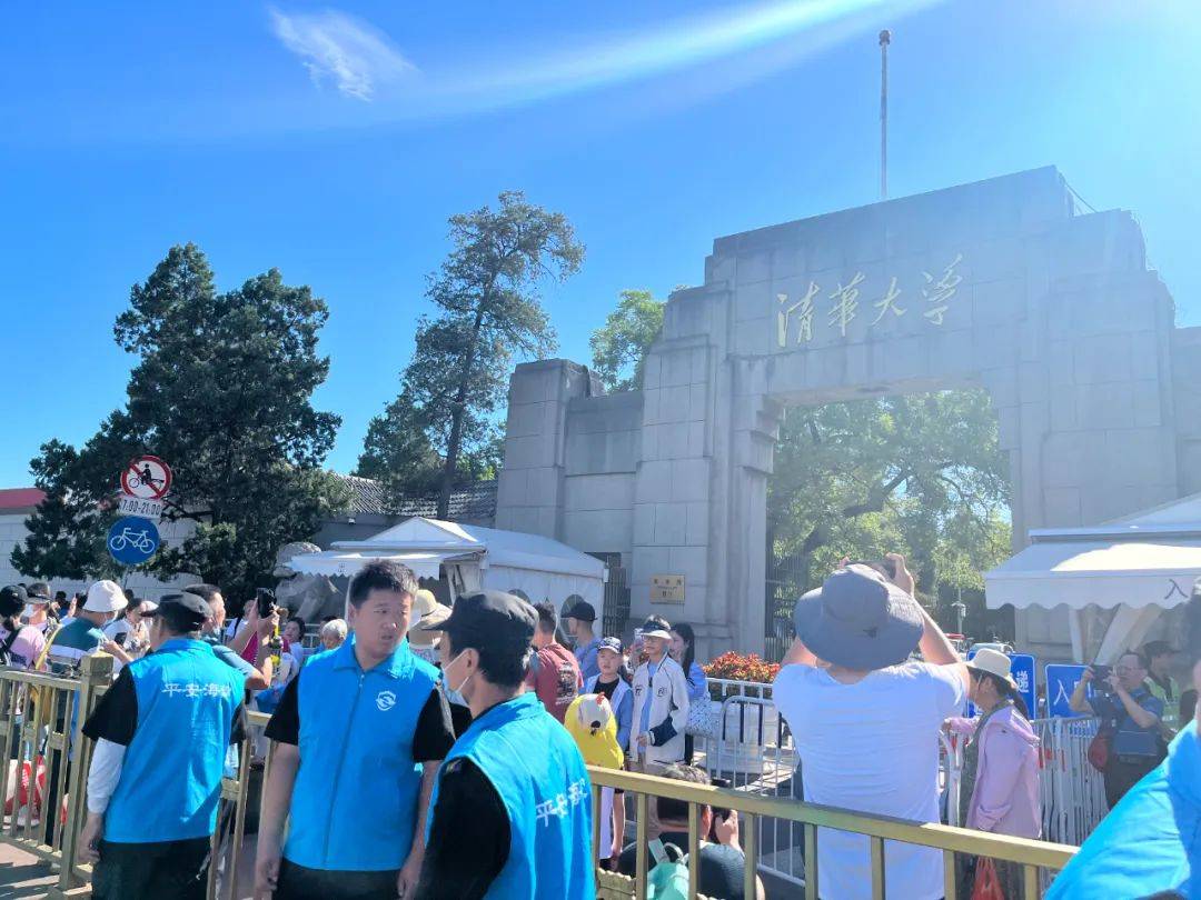 今早8时30分许,清华西门外,广播大声循环着安全提示,数十名保安、民警、志愿者等工作人员在游客参观通道处值守,维护着校门口的秩序。