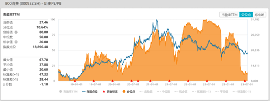 当前中证主要消费指数(000932)的指数点位已调整至2020年中水平,风险消化充分。估值方面,标的指数中证主要消费指数(000932) PE-TTM值27.46倍,位于近5年10.64%百分位,估值性价比凸显。