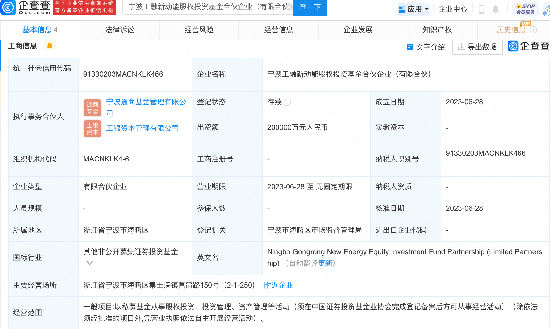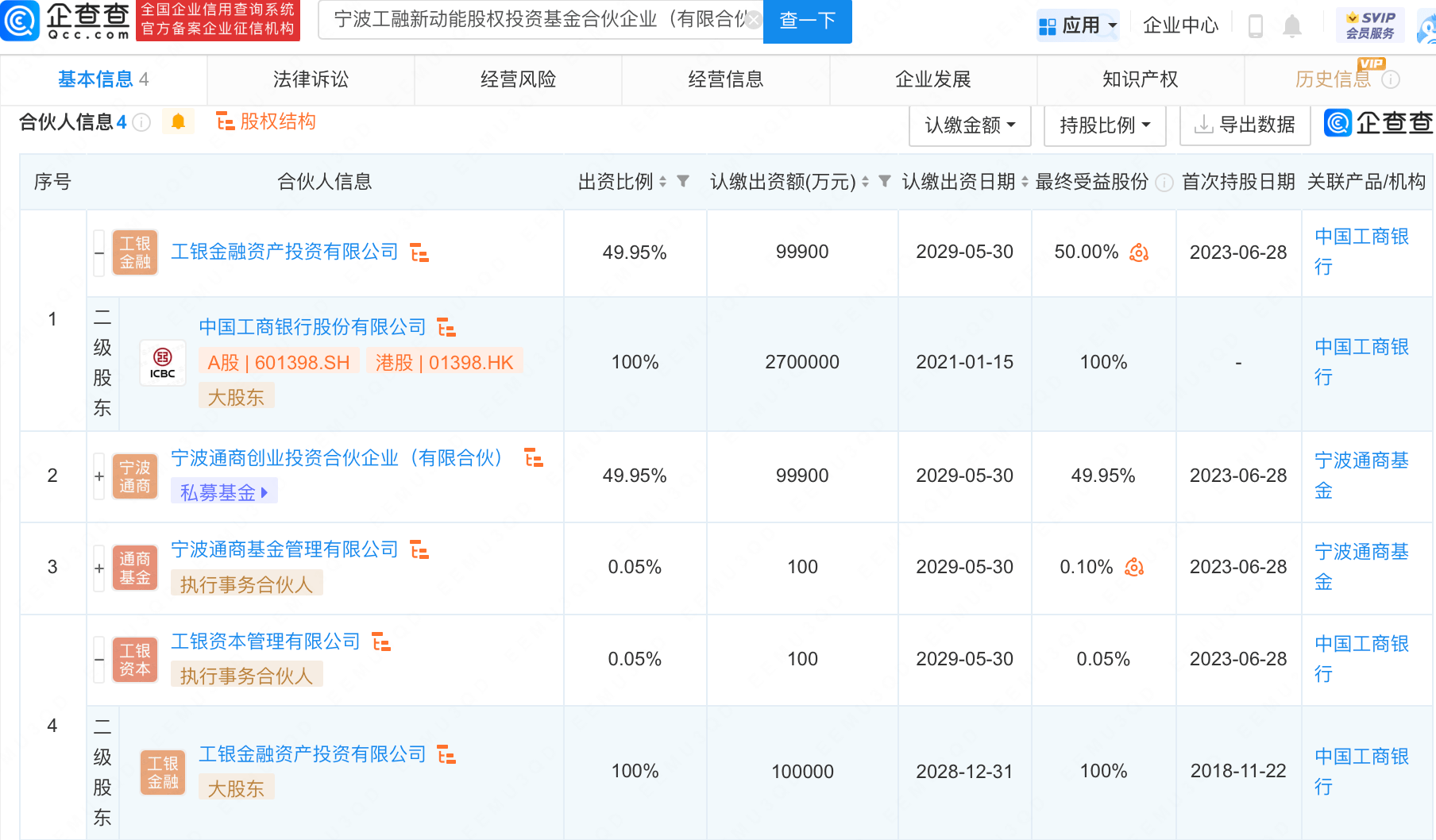 企查查APP显示,近日,宁波工融新动能股权投资基金合伙企业(有限合伙)成立,注册资本20亿元人民币,经营范围包含:以私募基金从事股权投资、投资管理、资产管理等活动。企查查股权穿透显示,该公司由工商银行(601398)旗下工银金融资产投资有限公司、工银资本管理有限公司等共同持股。