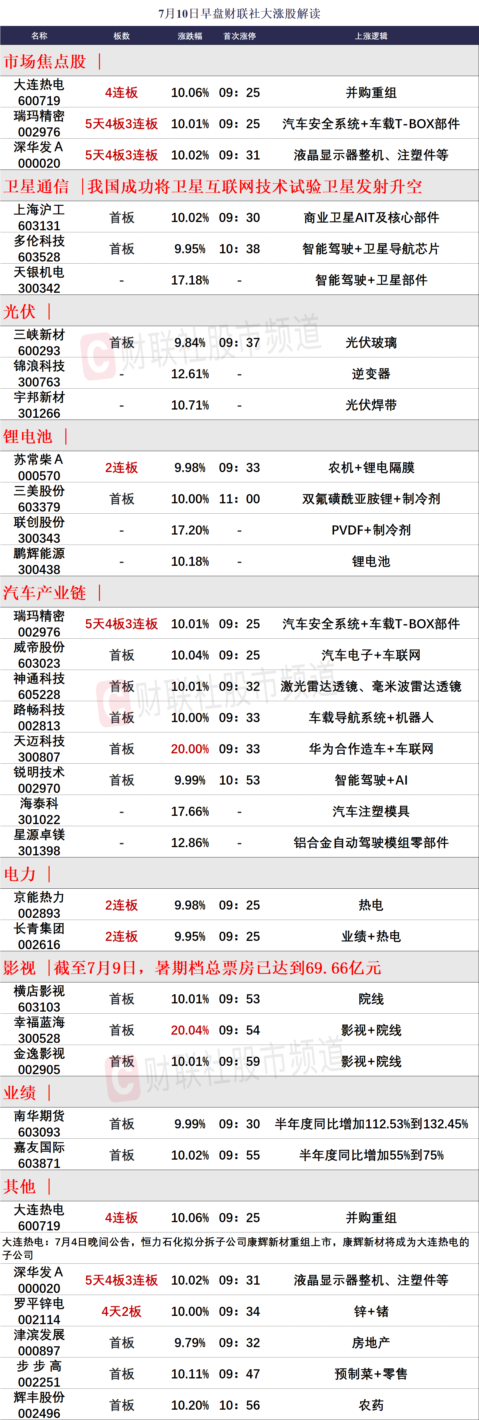 原标题:7月10日午间涨停分析