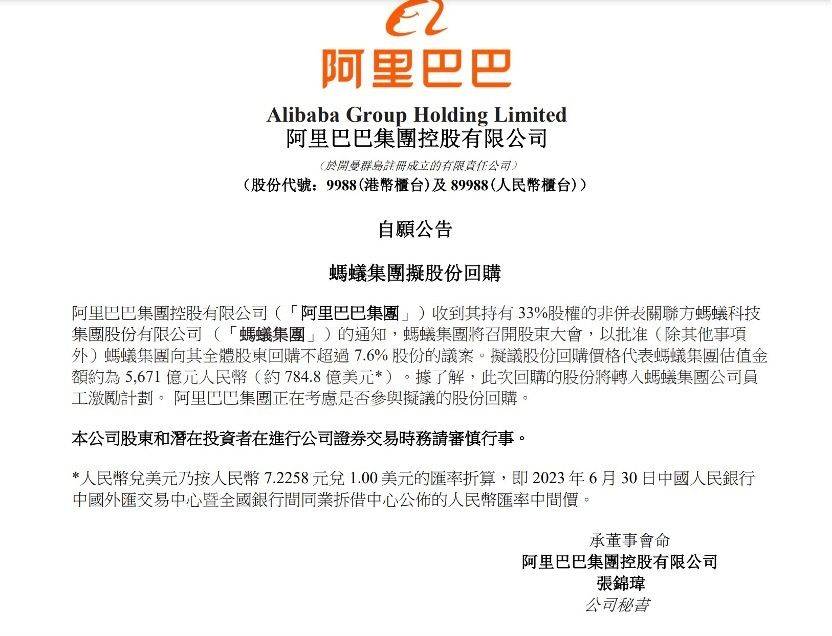 原标题:阿里巴巴:蚂蚁集团拟回购约5671亿元股份 正考虑是否参与