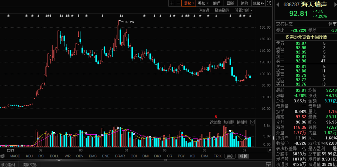 在AI光环的笼罩下,海天瑞声今年以来股价表现相当彪悍。2023年1月3日至3月29日,区区57个交易日,该股实现超330%的涨幅。不过,在3月29日冲涨至192.26元之后,股价有所回落,最新收盘价较最高点回撤42%。