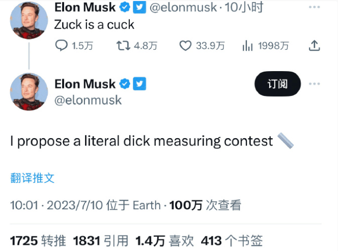 当一名推特用户转发这段对话时,马斯克注意到了,并回复道:“扎克是个软蛋。”(Zuck is a cuck)。cuck一词常被用来攻击那些政治上持自由主义观点的人。