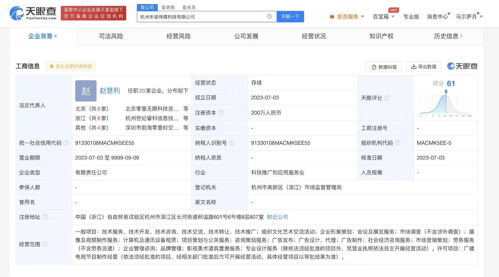 天眼查App显示,近日,杭州禾骏传媒科技有限公司成立,法定代表人为赵慧利,注册资本200万人民币,经营范围含技术服务、组织文化艺术交流活动、企业形象策划、广告制作、专业设计服务、广播电视节目制作经营等。