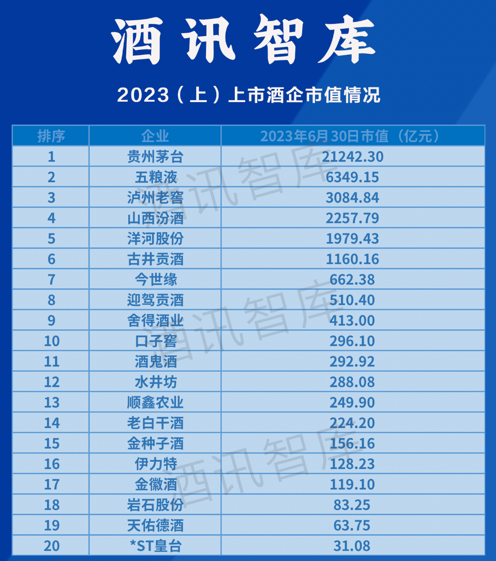 2023上半年,白酒股市值的排位并未发生太大变化。酒讯智库统计,2023上半年,20只白酒股总市值为3.96万亿元,较2022年期末的4.31万亿元减少0.35亿元。