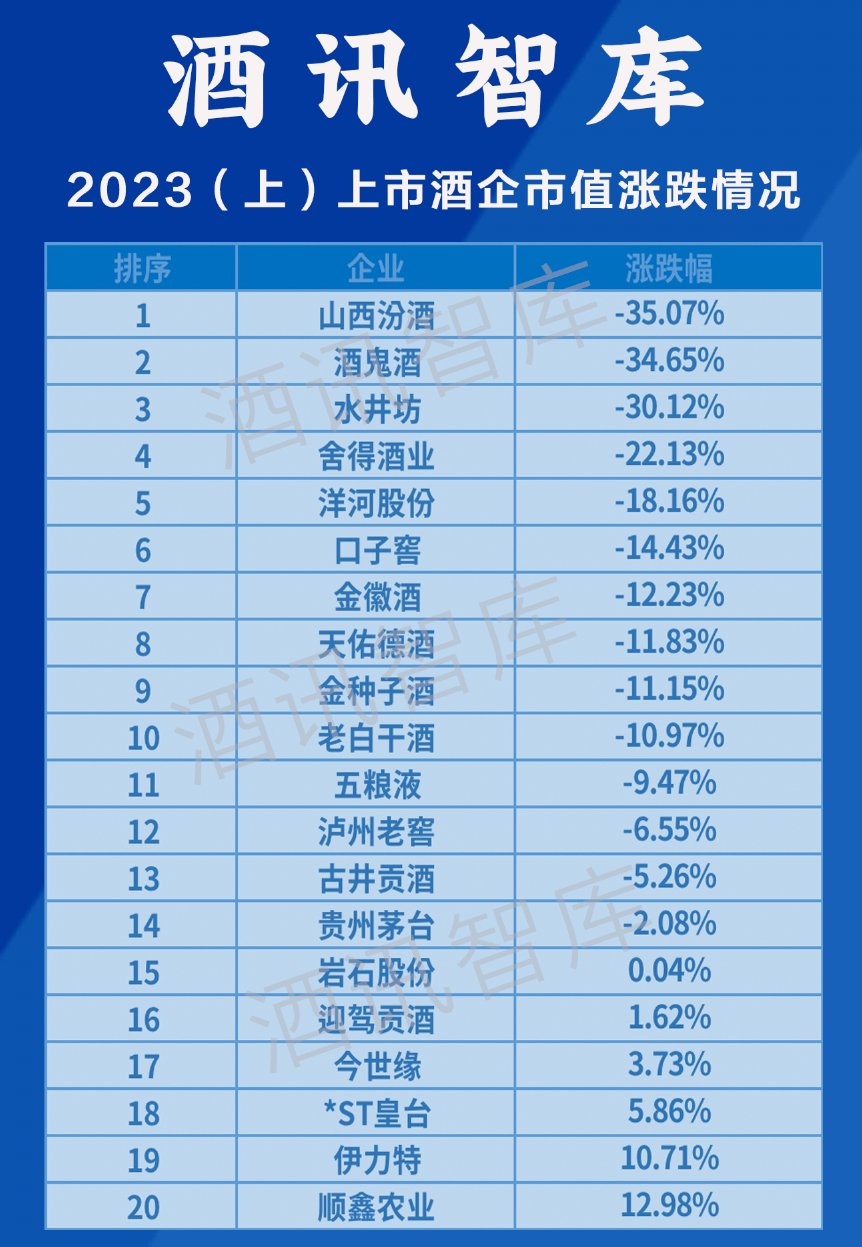 跌幅超过20%的酒企则主要集中在区域龙头酒企,这部分酒企也是目前次高端领域最具代表性的品牌。对比2022年期末的涨跌幅情况可以看到,2023上半年区域龙头酒企可以说基本都延续了上年跌势,屋漏偏逢连夜雨。